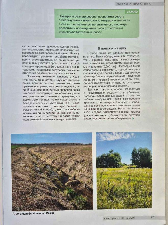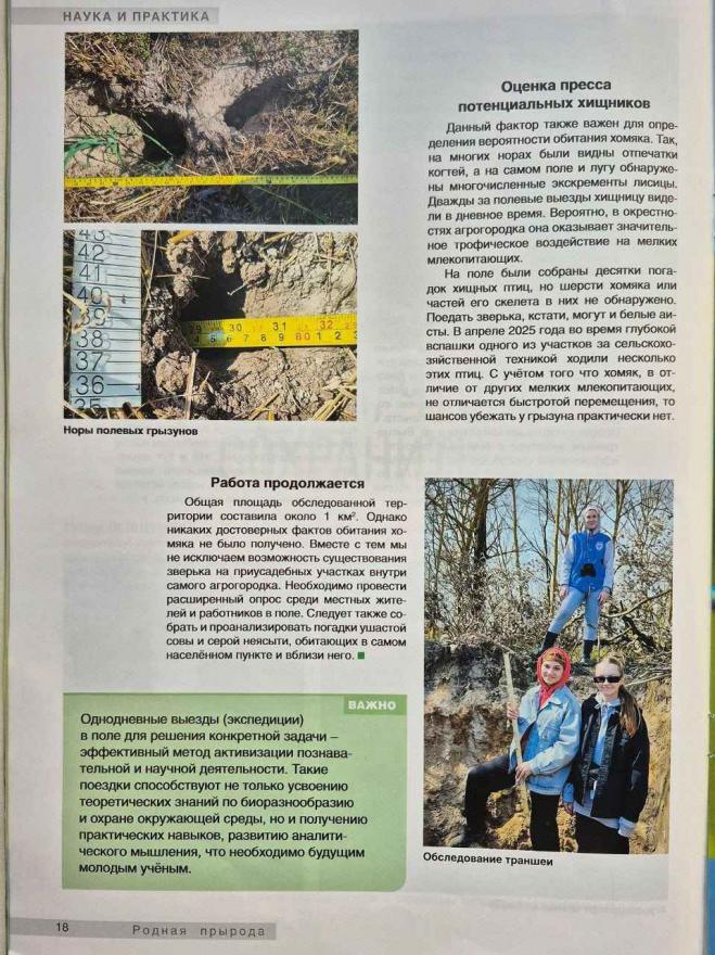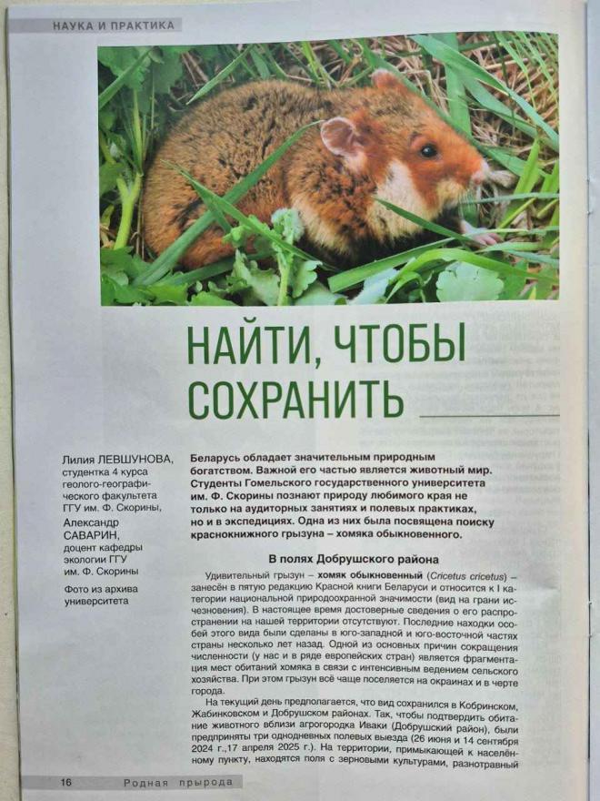 В журнале "Родная Прырода" (#10, 2025) опубликована заметка о научной работе студентов геолого-географического факультета по поиску крайне редкого и малочисленного вида млекопитающих в Беларуси - хомяка обыкновенного